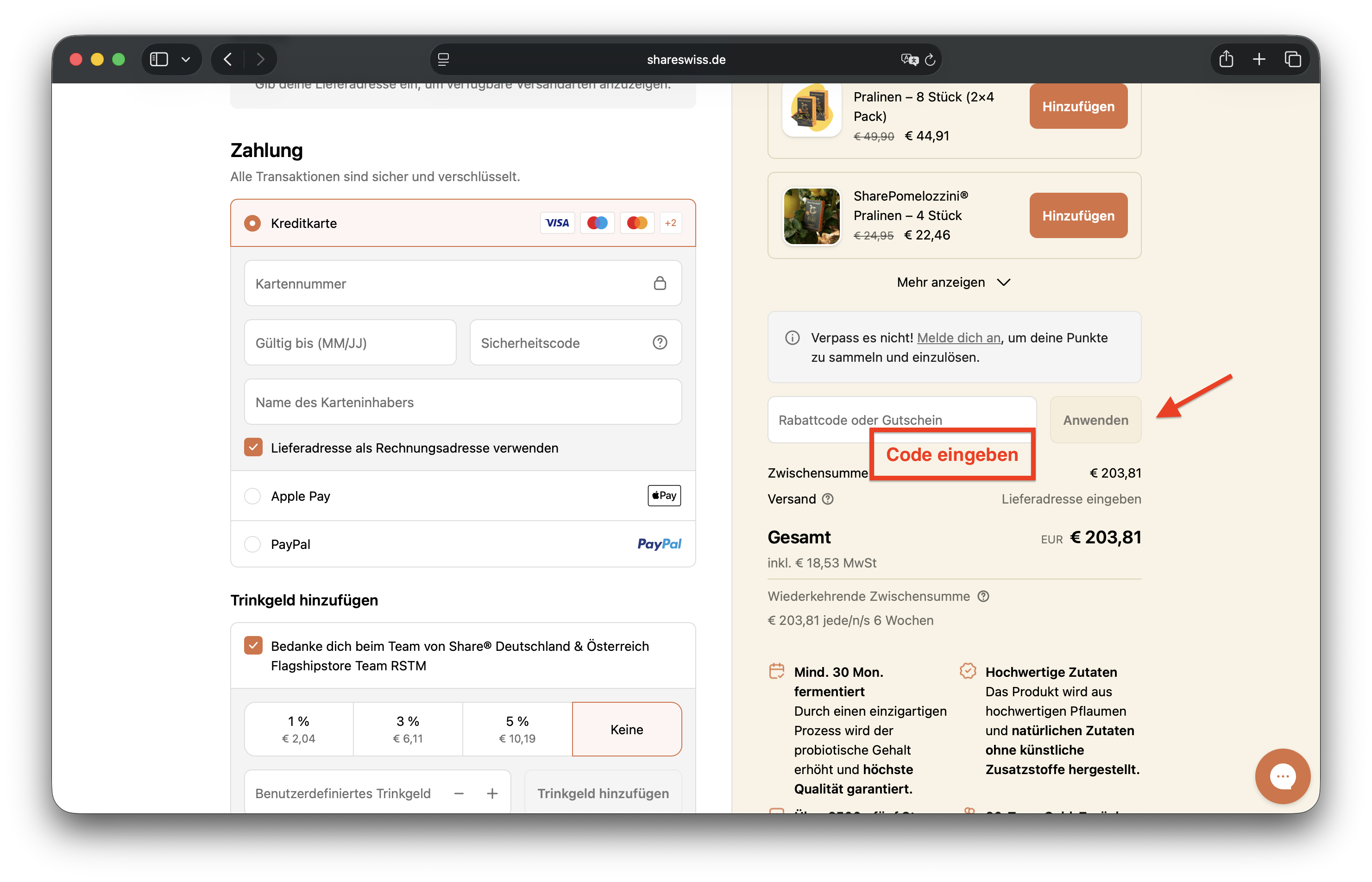 Nun befindest du dich im ersten Schritt vom Checkout-Prozess. Hier kannst du auf der rechten Seite den Code eingeben, den du zuvor generiert hast. Auf dem Smartphone kannst du den Code ganz oben eingeben.